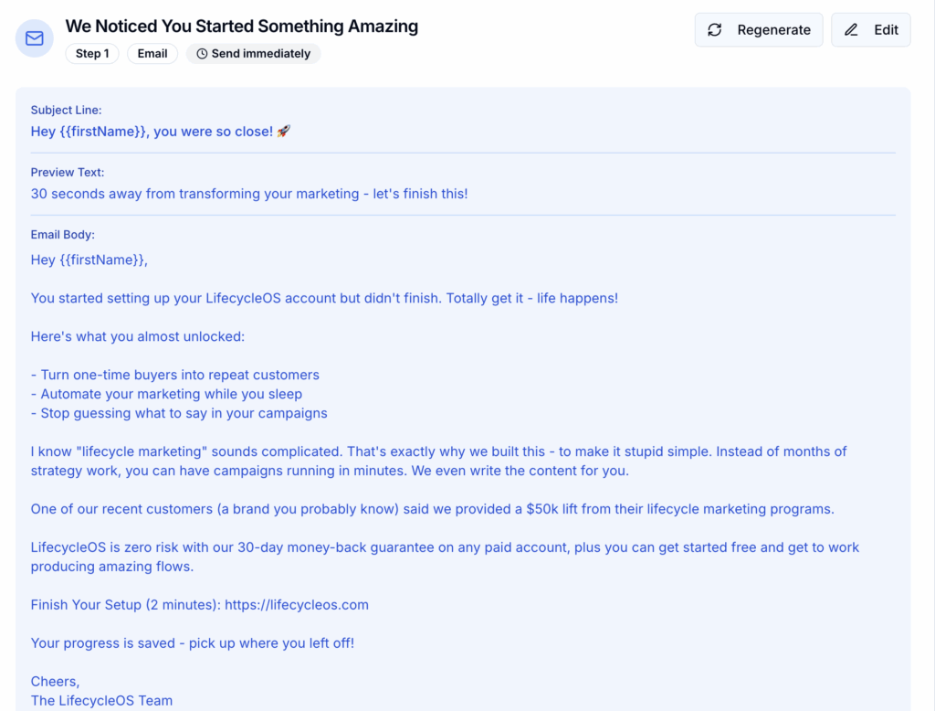 This abandoned cart recovery sequence targets prospects who showed interest in LifecycleOS but abandoned their signup or trial process. The goal is to convert confused or hesitant prospects into active users by addressing their main concerns (confusion, integration complexity, implementation timeline) while showcasing the platform’s value through free content and social proof. The output is a 7-day sequence combining education, social proof, and gentle persuasion to guide prospects back to complete their signup.