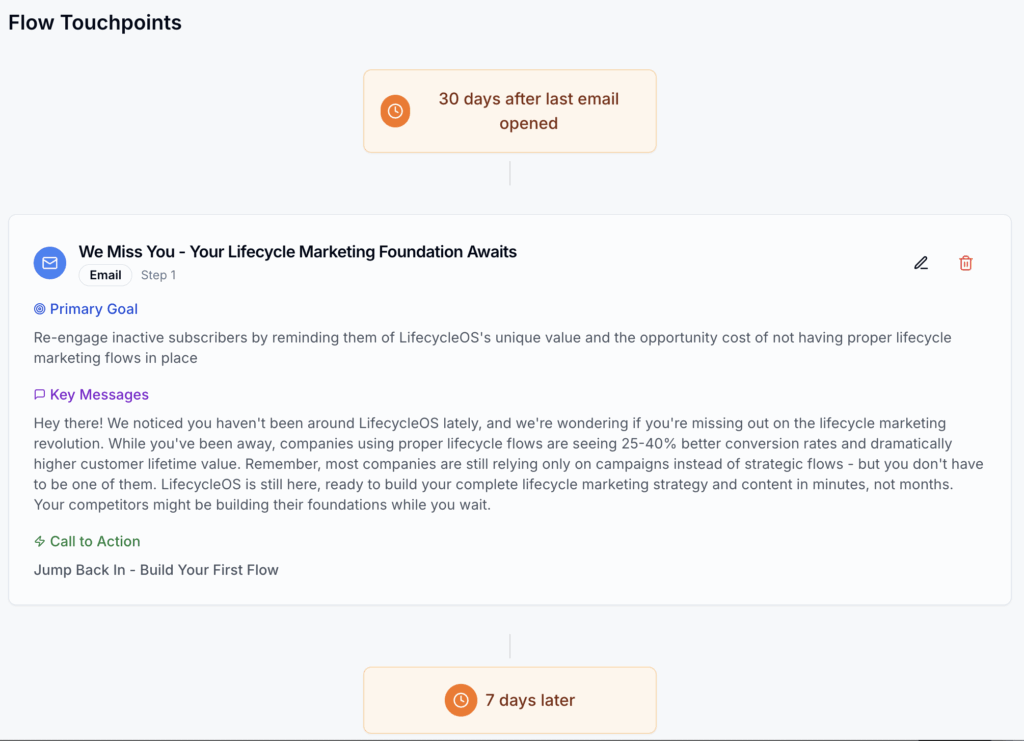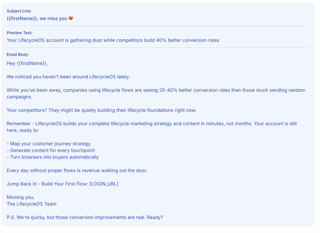 Sunset Flow for LifecycleOS – targeting disengaged users who haven’t interacted with the platform or emails for 30+ days. The goal is to re-engage inactive subscribers by reminding them of LifecycleOS’s unique value proposition – building comprehensive lifecycle marketing strategies and content that dramatically improves conversion rates and customer retention. This 4-touchpoint sequence progressively moves from value reminder to final engagement opportunity, ultimately cleaning the list of truly inactive subscribers while maximizing re-engagement opportunities.