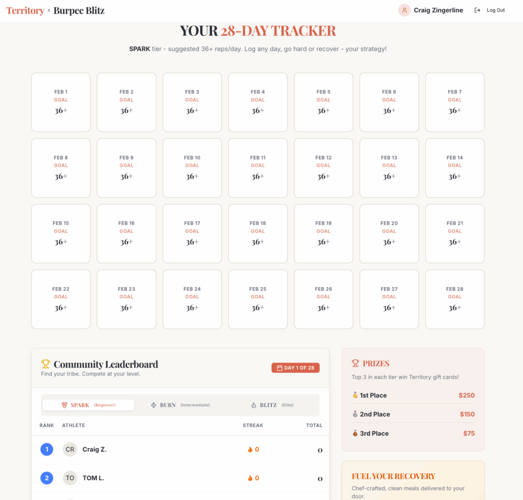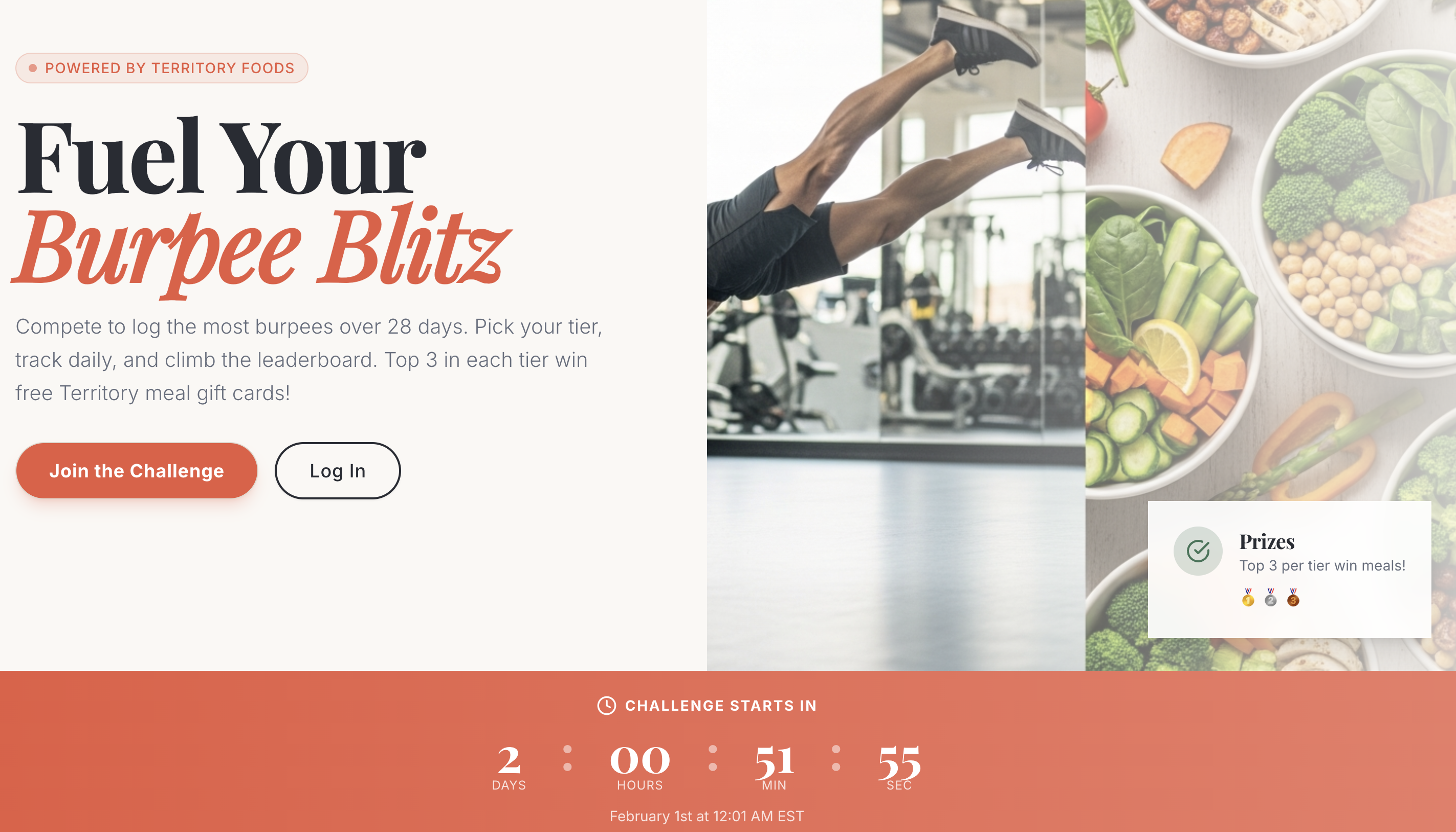 Territory Foods needed a way to engage their audience for a fitness challenge, and we delivered a streamlined 28-day challenge product that enables users to register, track the number of Burpee’s they did over a 28 day period, and see how they stack up on the leaderboard against their peers.