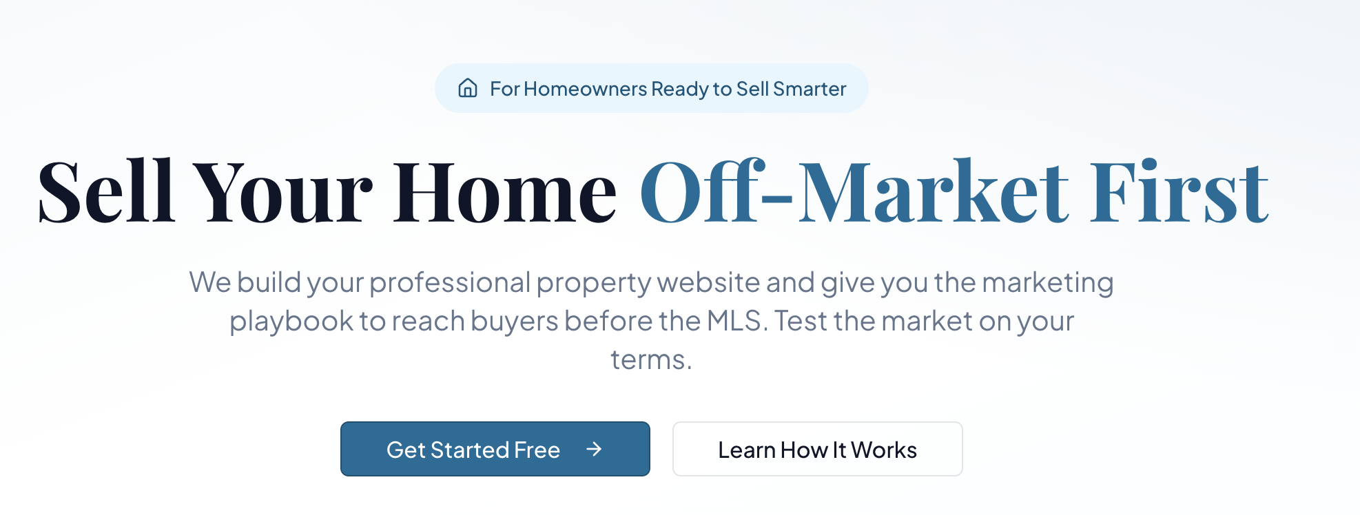 OffMarketFirst helps homeowners sell on their own terms before ever hitting the MLS – by building a professional property website and providing a clear marketing playbook to reach serious buyers directly. It’s a modern, owner-led way to test demand, control the process, and move fast without defaulting to the traditional listing path.